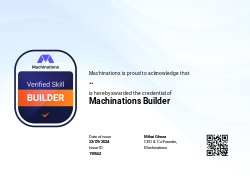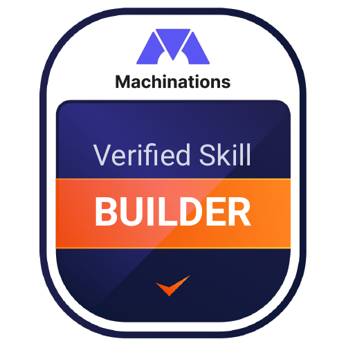 The BUILDER badge is a recognition awarded to users who have developed the skills to create basic systems using the Machinations framework. This badge celebrates their ability to construct functional and foundational systems within the platform.