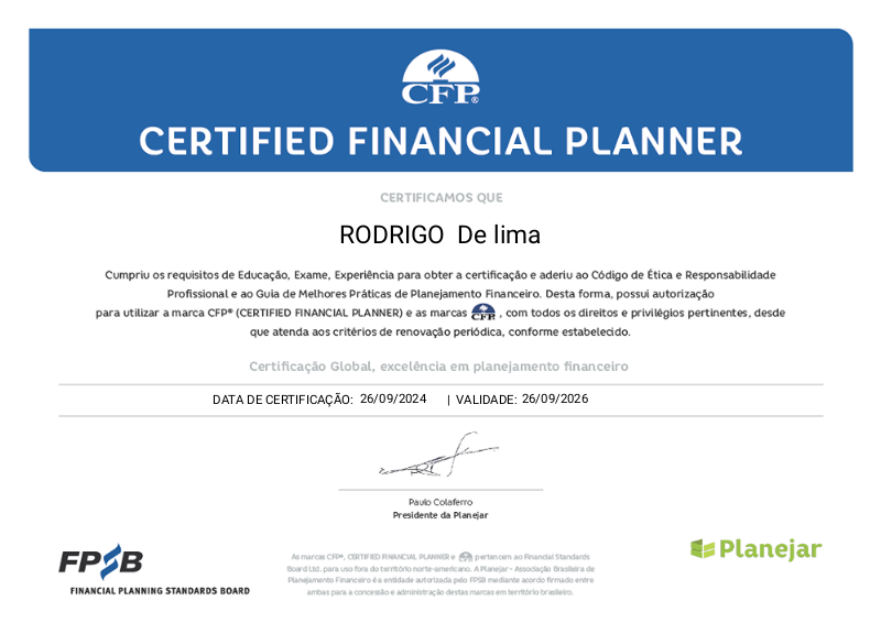 Símbolo de excelência em planejamento financeiro, o selo CFP® - Certified Financial Planner é a mais respeitada certificação internacional de distinção, garantido ao profissional certificado o reconhecimento de suas habilidades e competências na atividade de planejador financeiro pessoal e familiar por parte de seus clientes, parceiros e do mercado.