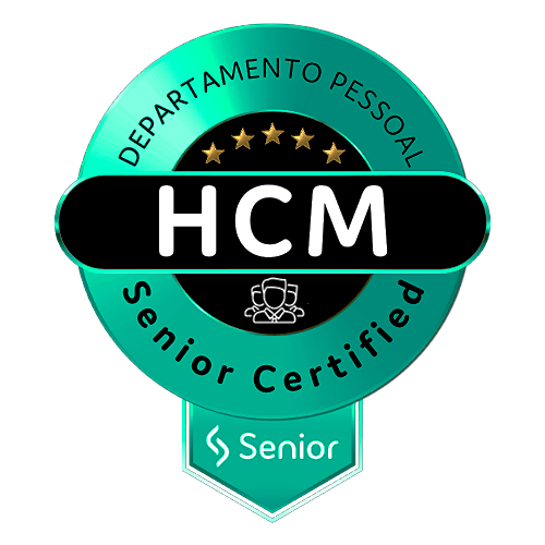 Esse badge é um reconhecimento para o profissional certificado em HCM - Soluções Departamento Pessoal Senior. Ele representa uma jornada composta pelos módulos: