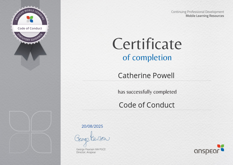 Code of Conduct helps staff in educational settings practise high standards of personal and professional conduct. Based on the Teachers' Standards, the course contains key information on how to uphold pupils' safety and welfare, build respectful, appropriate relationships with children and behave with integrity and maturity. It covers 17 key elements of professional conduct, including confidentiality, behaviour and appearance, reporting concerns and safeguarding.