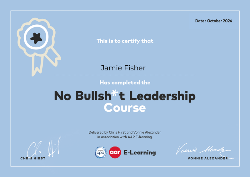 Certificate of completion and Digital Badge for 8 Modules of the No Bullsh*t Leadership Course, October 2024.