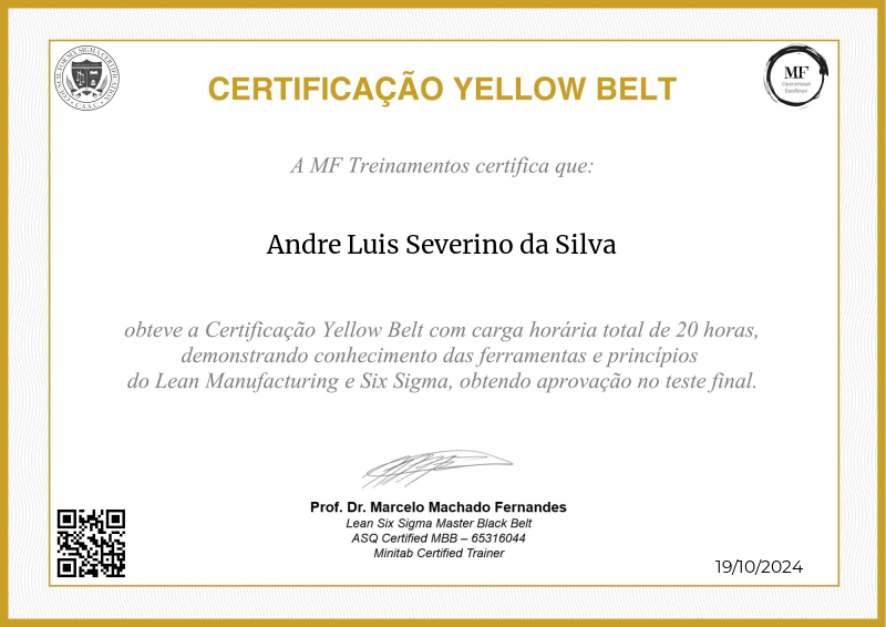 Adentrando nos princípios intermediários do Lean Six Sigma, a certificação Yellow Belt oferecida pela MF OPEX, sob a orientação do Professor Marcelo Fernandes, marca um avanço significativo no treinamento de excelência operacional. Através de um currículo meticulosamente estruturado que mescla teorias avançadas com aplicação prática, os participantes aprofundam seu entendimento em otimização de processos, análise avançada de dados e liderança de projetos. A renomada expertise do Professor Fernandes enriquece o programa com metodologias de ponta, capacitando os aprendizes a liderar melhorias impactantes dentro de suas organizações. Servindo como um marco pivotal no desenvolvimento profissional, esta certificação não apenas abre portas para projetos em maior escala, mas também cultiva a confiança e habilidades necessárias para impulsionar mudanças transformadoras em diversos setores da indústria.