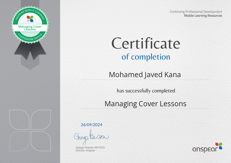 Awarded for completing the Managing Cover Lessons CPD course from Anspear.