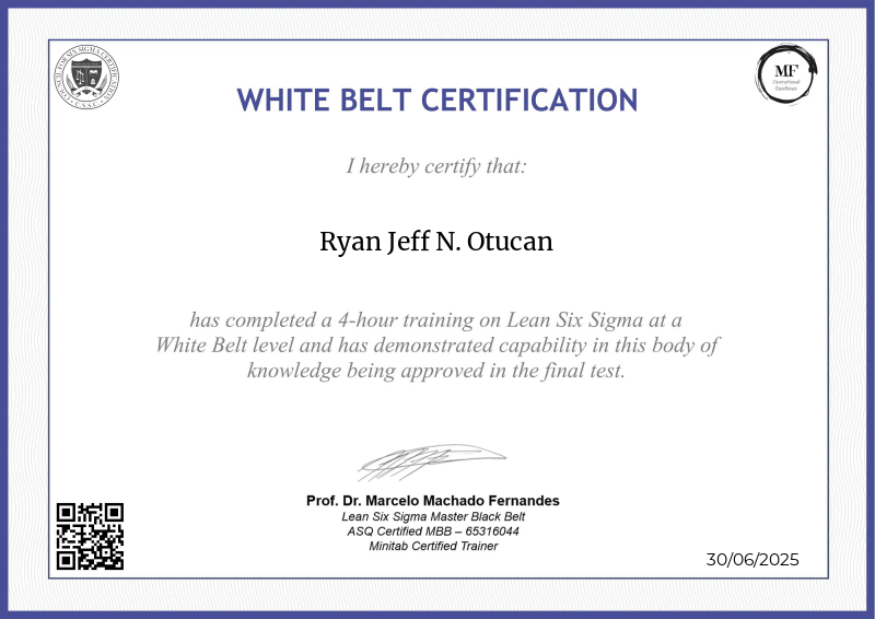 Unlocking the foundational principles of Lean Six Sigma, the White Belt certification offered by MF OPEX, led by Professor Marcelo Fernandes, stands as a beacon of excellence in operational training. Through a comprehensive curriculum blending theory with practical application, participants gain invaluable insights into waste reduction, variation management, and continuous improvement. Professor Fernandes' expertise infuses the program with industry-leading practices, equipping learners with the knowledge and skills to drive tangible improvements within their organizations. Serving as a catalyst for professional growth, this certification paves the way for further advancement in the field of operational excellence, empowering individuals to become agents of positive change in their respective industries.