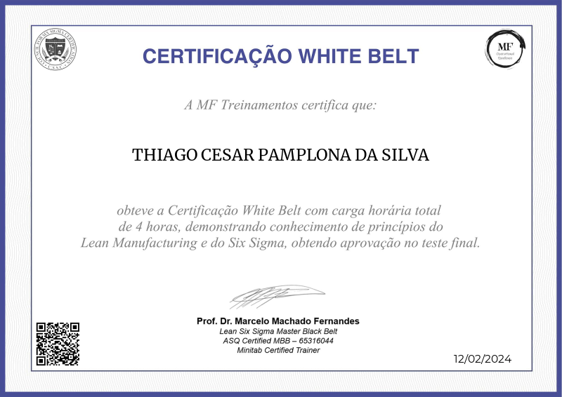 Desbloqueando os princípios fundamentais do Lean Six Sigma, a certificação White Belt oferecida pela MF OPEX, liderada pelo Professor Marcelo Fernandes, destaca-se como um farol de excelência em treinamento operacional. Através de um currículo abrangente que combina teoria com aplicação prática, os participantes adquirem insights inestimáveis sobre redução de desperdícios, gestão de variação e melhoria contínua. A expertise do Professor Fernandes infunde o programa com práticas líderes do setor, equipando os aprendizes com o conhecimento e as habilidades necessárias para impulsionar melhorias tangíveis dentro de suas organizações. Servindo como catalisador para o crescimento profissional, esta certificação abre caminho para avanços adicionais no campo da excelência operacional, capacitando os indivíduos a se tornarem agentes de mudança positiva em suas respectivas indústrias.