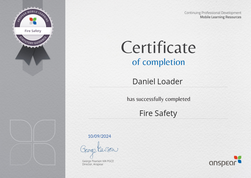 Awarded for completing the Fire Safety CPD course from Anspear.