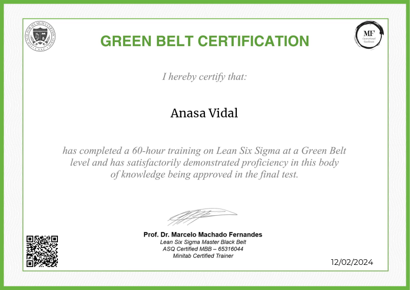 Exploring the principles of Lean Six Sigma, the Green Belt certification offered by MF OPEX, under the mentorship of Professor Marcelo Fernandes, represents a pivotal step forward in operational excellence training. Equipped with an extensive curriculum blending advanced theories with hands-on application, participants not only deepen their understanding of process optimization, advanced data analysis, and project leadership but also become adept at spearheading Lean Six Sigma projects. Professor Fernandes' esteemed guidance enriches the program with cutting-edge methodologies, empowering learners to drive substantial improvements within their organizations. Serving as a significant milestone in professional development, this certification not only qualifies individuals to lead larger-scale projects but also instills the confidence and expertise needed to enact transformative change across diverse industry landscapes.