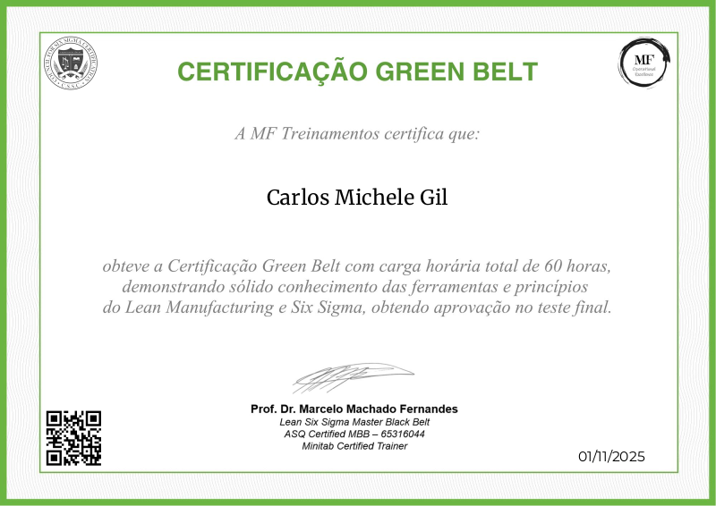 Explorando os princípios do Lean Six Sigma, a certificação Green Belt fornecida pela MF OPEX, sob a orientação do Professor Marcelo Fernandes, representa um avanço significativo no treinamento de excelência operacional. Com um currículo abrangente que mescla teorias avançadas com aplicação prática, os participantes aprofundam sua compreensão em otimização de processos, análise avançada de dados e liderança de projetos. Além disso, os Green Belts estão capacitados para liderar projetos Lean Six Sigma, guiando equipes por iniciativas complexas com confiança e expertise. A orientação estimada do Professor Fernandes enriquece o programa com metodologias de ponta, capacitando os aprendizes a impulsionar melhorias substanciais dentro de suas organizações. Servindo como um marco crucial no desenvolvimento profissional, esta certificação não apenas qualifica indivíduos para liderar projetos em maior escala, mas também incute a confiança e competências necessárias para promover mudanças transformadoras em diversos cenários da indústria.