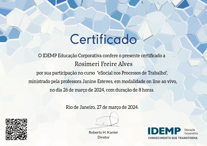 Graduada em Direito. Latu Sensu em: Direito do Trabalho, Direito Previdenciário, Gestão de Recursos Humanos, Gestão de Pessoas e Docência do Ensino Superior.