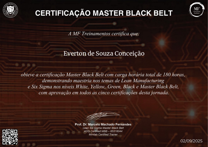 Imersos nos princípios avançados do Lean Six Sigma, a certificação Master Black Belt, concedida pela MF OPEX sob a orientação estimada do Professor Marcelo Fernandes, representa o ápice em excelência operacional para análise e solução de problemas complexos. Com um conhecimento e expertise inigualáveis, Master Black Belts possuem uma compreensão abrangente da metodologia Lean Six Sigma e habilidades avançadas de liderança, capacitando-os a promover mudanças transformadoras em um nível estratégico dentro de suas organizações. Servindo como o ponto mais alto do desenvolvimento profissional, esta certificação não apenas confirma a proficiência dos indivíduos para liderar iniciativas altamente complexas e estratégicas, mas também os capacita a moldar o futuro de suas organizações, cultivando uma cultura de aprimoramento contínuo e excelência em todas as áreas da indústria.