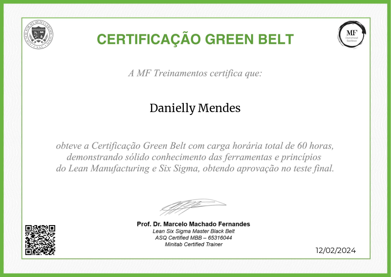 Explorando os princípios do Lean Six Sigma, a certificação Green Belt fornecida pela MF OPEX, sob a orientação do Professor Marcelo Fernandes, representa um avanço significativo no treinamento de excelência operacional. Com um currículo abrangente que mescla teorias avançadas com aplicação prática, os participantes aprofundam sua compreensão em otimização de processos, análise avançada de dados e liderança de projetos. Além disso, os Green Belts estão capacitados para liderar projetos Lean Six Sigma, guiando equipes por iniciativas complexas com confiança e expertise. A orientação estimada do Professor Fernandes enriquece o programa com metodologias de ponta, capacitando os aprendizes a impulsionar melhorias substanciais dentro de suas organizações. Servindo como um marco crucial no desenvolvimento profissional, esta certificação não apenas qualifica indivíduos para liderar projetos em maior escala, mas também incute a confiança e competências necessárias para promover mudanças transformadoras em diversos cenários da indústria.