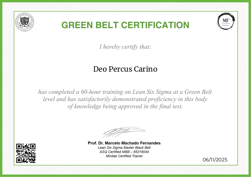 Exploring the principles of Lean Six Sigma, the Green Belt certification offered by MF OPEX, under the mentorship of Professor Marcelo Fernandes, represents a pivotal step forward in operational excellence training. Equipped with an extensive curriculum blending advanced theories with hands-on application, participants not only deepen their understanding of process optimization, advanced data analysis, and project leadership but also become adept at spearheading Lean Six Sigma projects. Professor Fernandes' esteemed guidance enriches the program with cutting-edge methodologies, empowering learners to drive substantial improvements within their organizations. Serving as a significant milestone in professional development, this certification not only qualifies individuals to lead larger-scale projects but also instills the confidence and expertise needed to enact transformative change across diverse industry landscapes.