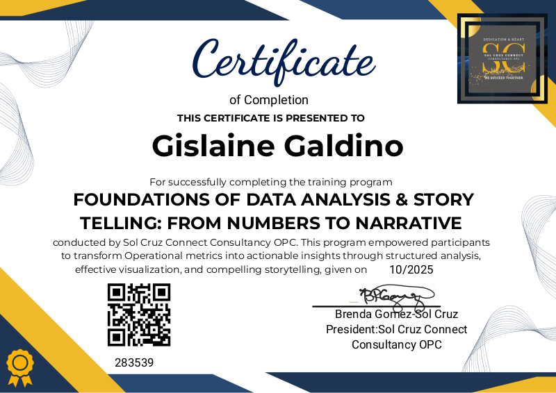 Developed and delivered by Sol Cruz Connect Consultancy OPC, this program bridges analytical thinking and communication, guiding learners through the complete Data-to-Insight Journey — from data collection and cleansing, to visualization and storytelling.