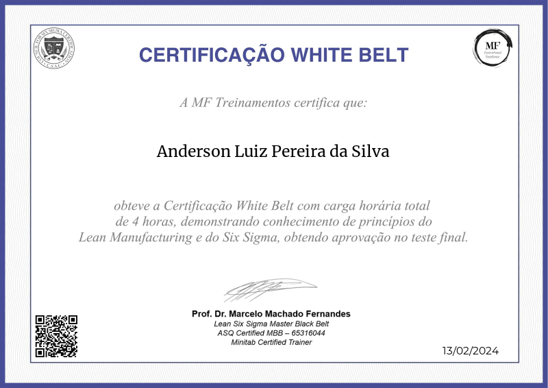 Desbloqueando os princípios fundamentais do Lean Six Sigma, a certificação White Belt oferecida pela MF OPEX, liderada pelo Professor Marcelo Fernandes, destaca-se como um farol de excelência em treinamento operacional. Através de um currículo abrangente que combina teoria com aplicação prática, os participantes adquirem insights inestimáveis sobre redução de desperdícios, gestão de variação e melhoria contínua. A expertise do Professor Fernandes infunde o programa com práticas líderes do setor, equipando os aprendizes com o conhecimento e as habilidades necessárias para impulsionar melhorias tangíveis dentro de suas organizações. Servindo como catalisador para o crescimento profissional, esta certificação abre caminho para avanços adicionais no campo da excelência operacional, capacitando os indivíduos a se tornarem agentes de mudança positiva em suas respectivas indústrias.