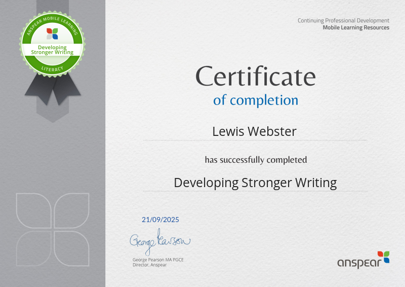 Awarded for completing the Developing Stronger Writing CPD course from Anspear.