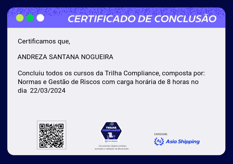 A Trilha Compliance é mais uma Badge do programa de certificação da Asia Shipping. Com ela você terá a oportunidade de conhecer mas sobre Compliance na Asia Shipping, como também Gestão de Riscos, suas principais definições e etapas de identificação.