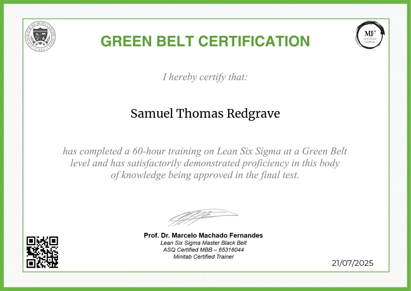 Exploring the principles of Lean Six Sigma, the Green Belt certification offered by MF OPEX, under the mentorship of Professor Marcelo Fernandes, represents a pivotal step forward in operational excellence training. Equipped with an extensive curriculum blending advanced theories with hands-on application, participants not only deepen their understanding of process optimization, advanced data analysis, and project leadership but also become adept at spearheading Lean Six Sigma projects. Professor Fernandes' esteemed guidance enriches the program with cutting-edge methodologies, empowering learners to drive substantial improvements within their organizations. Serving as a significant milestone in professional development, this certification not only qualifies individuals to lead larger-scale projects but also instills the confidence and expertise needed to enact transformative change across diverse industry landscapes.