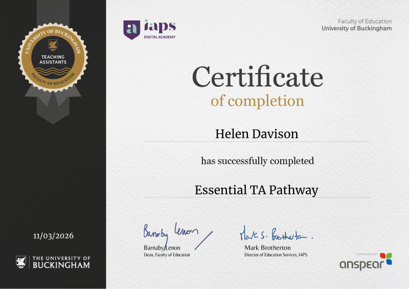 Essential TA is designed for new and experienced TAs, and focuses on literacy and numeracy support and positive behaviour management. Perfect for those seeking to enhance their effectiveness in the classroom or refresh their TA expertise.