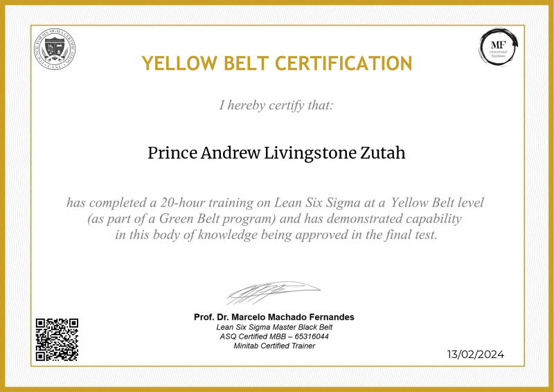 Delving into the intermediate principles of Lean Six Sigma, the Yellow Belt certification provided by MF OPEX, guided by Professor Marcelo Fernandes, marks a significant progression in operational excellence training. Through a meticulously structured curriculum blending advanced theories with practical application, participants deepen their understanding of process optimization, advanced data analysis, and project leadership. Professor Fernandes' renowned expertise enriches the program with cutting-edge methodologies, empowering learners to spearhead impactful improvements within their organizations. Serving as a pivotal milestone in professional development, this certification not only opens doors to larger-scale projects but also fosters the confidence and skills needed to drive transformative change across diverse industry landscapes.