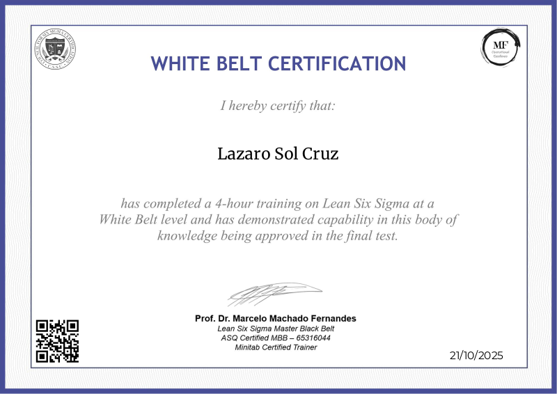 Unlocking the foundational principles of Lean Six Sigma, the White Belt certification offered by MF OPEX, led by Professor Marcelo Fernandes, stands as a beacon of excellence in operational training. Through a comprehensive curriculum blending theory with practical application, participants gain invaluable insights into waste reduction, variation management, and continuous improvement. Professor Fernandes' expertise infuses the program with industry-leading practices, equipping learners with the knowledge and skills to drive tangible improvements within their organizations. Serving as a catalyst for professional growth, this certification paves the way for further advancement in the field of operational excellence, empowering individuals to become agents of positive change in their respective industries.