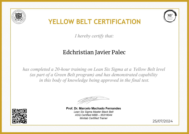 Delving into the intermediate principles of Lean Six Sigma, the Yellow Belt certification provided by MF OPEX, guided by Professor Marcelo Fernandes, marks a significant progression in operational excellence training. Through a meticulously structured curriculum blending advanced theories with practical application, participants deepen their understanding of process optimization, advanced data analysis, and project leadership. Professor Fernandes' renowned expertise enriches the program with cutting-edge methodologies, empowering learners to spearhead impactful improvements within their organizations. Serving as a pivotal milestone in professional development, this certification not only opens doors to larger-scale projects but also fosters the confidence and skills needed to drive transformative change across diverse industry landscapes.