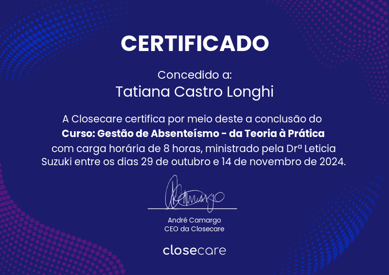 O curso de Gestão de Absenteísmo: da Teoria à Prática aconteceu online e ao vivo entre os dias 29 de outubro e 14 de novembro. As aulas foram ministradas pela Drª Leticia Suzuki (https://www.linkedin.com/in/leticia-cristina-suzuki-621585131/). O curso foi composto por seis aulas que abordaram os seguintes tópicos: