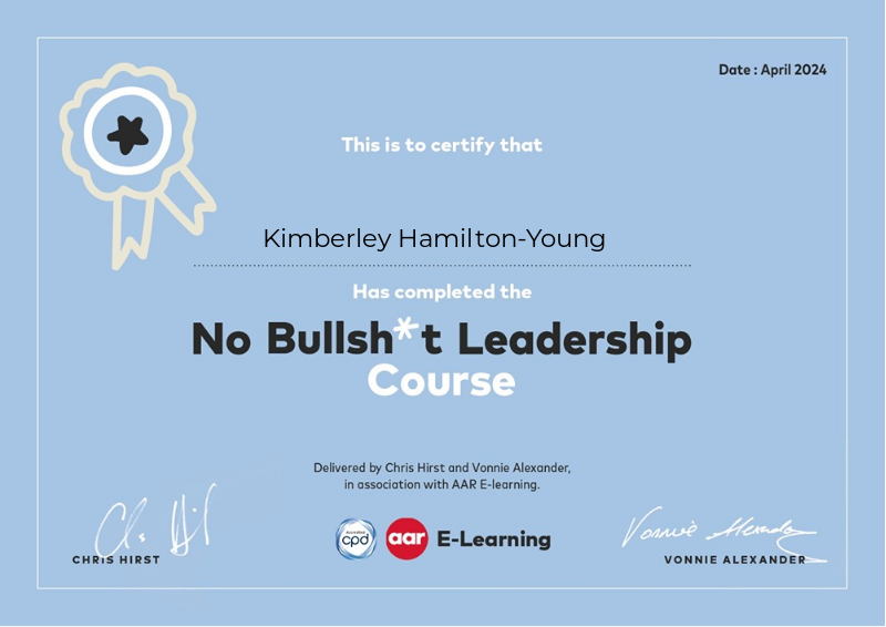 Certificate of completion and Digital Badge for 8 Modules of the No Bullsh*t Leadership Course, April 2024.