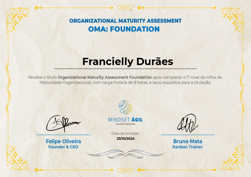 Para receber o certificado Organizational Maturity Assessment Foundation, o/a profissional deve completar uma formação credenciada pela Mindset Ágil®, de 9 horas, participando de todas sessões da formação. Além disso, deve cumprir com todos os deveres relacionados ao trabalho de conclusão, apresentando o case para a turma.