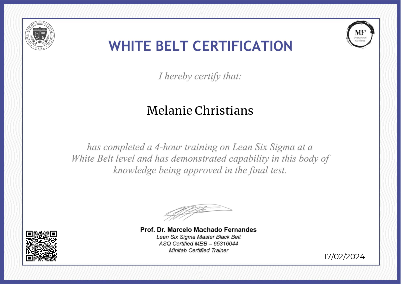 Unlocking the foundational principles of Lean Six Sigma, the White Belt certification offered by MF OPEX, led by Professor Marcelo Fernandes, stands as a beacon of excellence in operational training. Through a comprehensive curriculum blending theory with practical application, participants gain invaluable insights into waste reduction, variation management, and continuous improvement. Professor Fernandes' expertise infuses the program with industry-leading practices, equipping learners with the knowledge and skills to drive tangible improvements within their organizations. Serving as a catalyst for professional growth, this certification paves the way for further advancement in the field of operational excellence, empowering individuals to become agents of positive change in their respective industries.