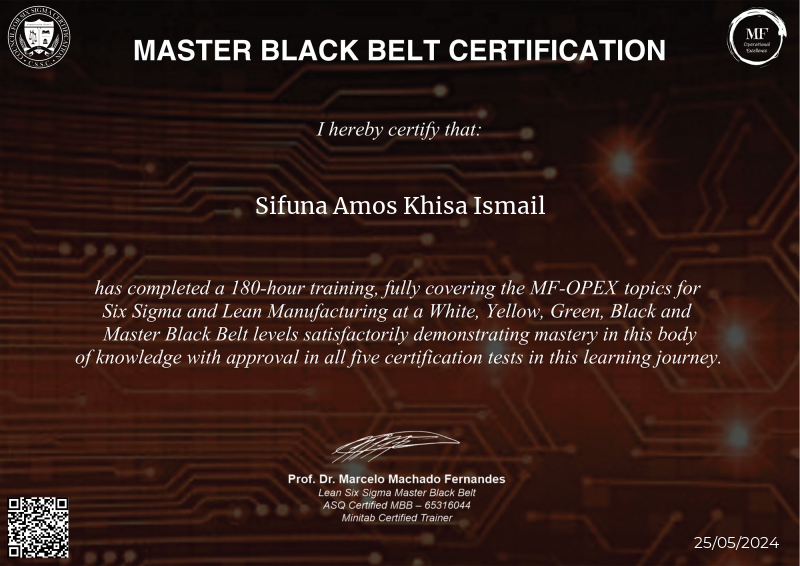 Diving into the advanced principles of Lean Six Sigma, the Master Black Belt certification, the pinnacle achievement provided by MF OPEX under the esteemed guidance of Professor Marcelo Fernandes, signifies the ultimate level of mastery in operational excellence training. With an unparalleled depth of knowledge and expertise, Master Black Belts possess a comprehensive understanding of Lean Six Sigma methodologies and advanced leadership capabilities, enabling them to drive transformative changes on a strategic level within their organizations. Serving as the pinnacle of professional development, this certification not only validates individuals' abilities to lead highly complex and strategic initiatives but also empowers them to shape the future of their organizations by fostering a culture of continuous improvement and excellence across all facets of the industry.
