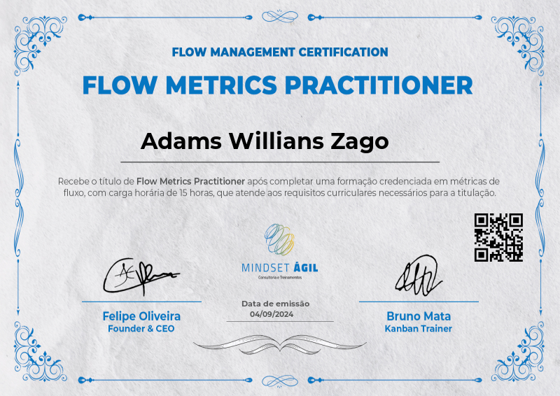 Para se tornar um Flow Metrics Practitioner, o/a profissional deve completar uma formação credenciada pela Mindset Ágil®, de 15 horas, participando de no mínimo 4 das 5 sessões da formação.