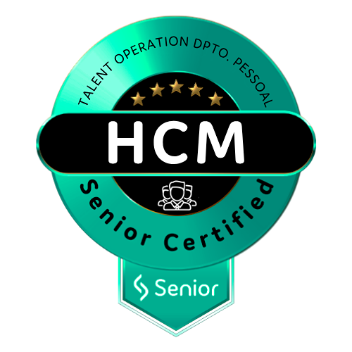 Esse badge é um reconhecimento para o profissional certificado em HCM - Soluções Talent Operation Dpto. Pessoal Senior. Ele representa uma jornada composta pelos módulos: