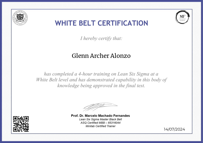 Unlocking the foundational principles of Lean Six Sigma, the White Belt certification offered by MF OPEX, led by Professor Marcelo Fernandes, stands as a beacon of excellence in operational training. Through a comprehensive curriculum blending theory with practical application, participants gain invaluable insights into waste reduction, variation management, and continuous improvement. Professor Fernandes' expertise infuses the program with industry-leading practices, equipping learners with the knowledge and skills to drive tangible improvements within their organizations. Serving as a catalyst for professional growth, this certification paves the way for further advancement in the field of operational excellence, empowering individuals to become agents of positive change in their respective industries.