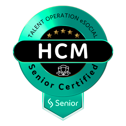 Esse badge é um reconhecimento para o profissional certificado em HCM - Soluções Talent Operation eSocial Senior. Ele representa uma jornada composta pelos módulos: