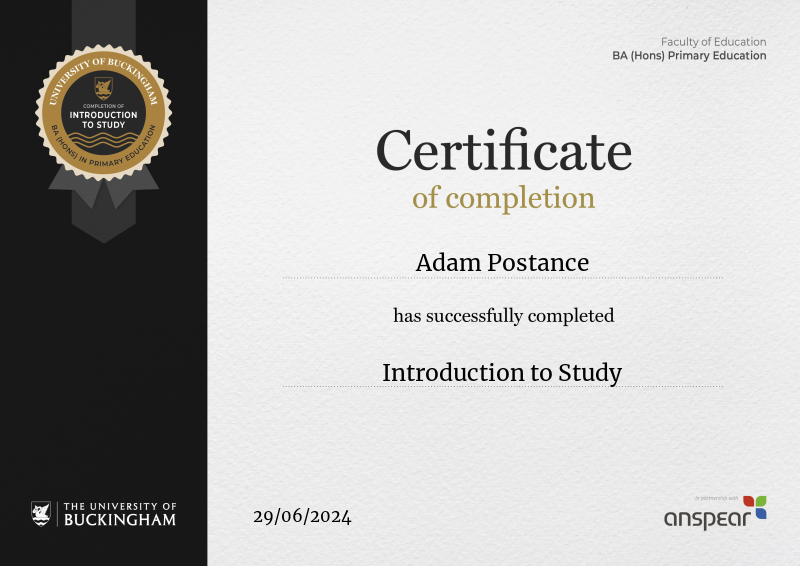 You've finished the Introduction to Study course! The course helped you prepare to start the BA Primary Education course.