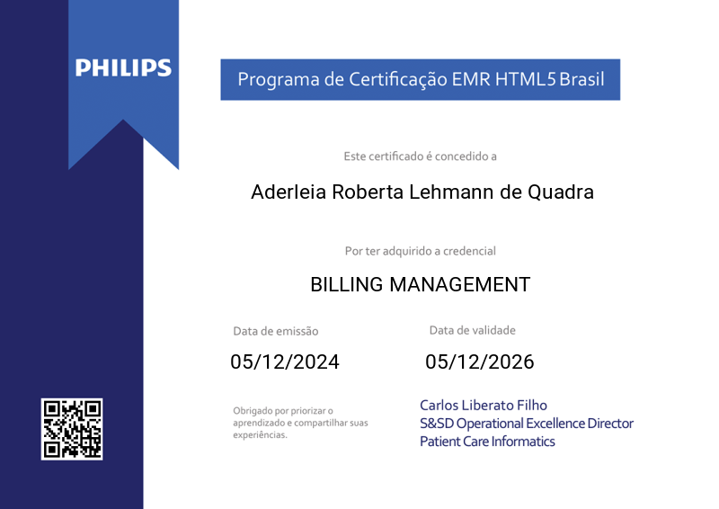 A credencial de PROFESSIONAL BILLING MANAGEMENT é dividida em Cadastros de Faturamento, que abrange convênios, preços e regras, conta do paciente, parâmetros de faturamento e gestão de Órteses, Próteses e Materiais Especiais (OPME); e uma avaliação específica sobre Troca de Informações em Saúde Suplementar (TISS).