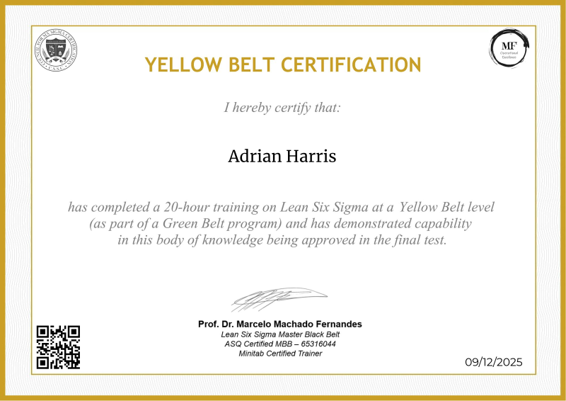 Delving into the intermediate principles of Lean Six Sigma, the Yellow Belt certification provided by MF OPEX, guided by Professor Marcelo Fernandes, marks a significant progression in operational excellence training. Through a meticulously structured curriculum blending advanced theories with practical application, participants deepen their understanding of process optimization, advanced data analysis, and project leadership. Professor Fernandes' renowned expertise enriches the program with cutting-edge methodologies, empowering learners to spearhead impactful improvements within their organizations. Serving as a pivotal milestone in professional development, this certification not only opens doors to larger-scale projects but also fosters the confidence and skills needed to drive transformative change across diverse industry landscapes.