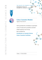 Completed the Colour Cosmetics module on the Society of Cosmetic Scientists (SCS) Introduction to Cosmetic Science (ICS) course and passed the module test.