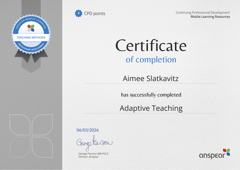 Awarded for completing the Adaptive Teaching CPD course from Anspear.