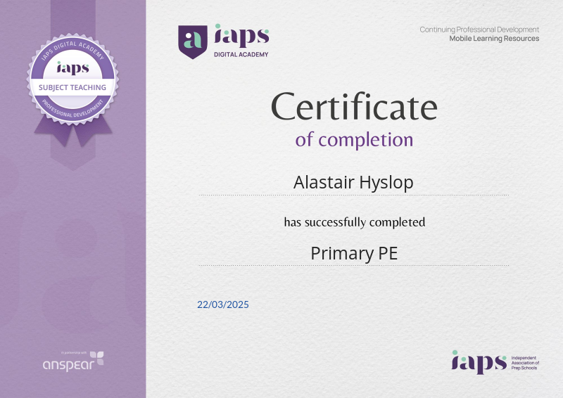 Awarded for completing the Primary PE CPD course from the IAPS Digital Academy.