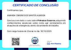 Esta badge digital certifica a conclusão do Treinamento de Primeiros Socorros da Asia Shipping, demonstrando um compromisso proativo com a segurança e a saúde de todos no ambiente de trabalho.