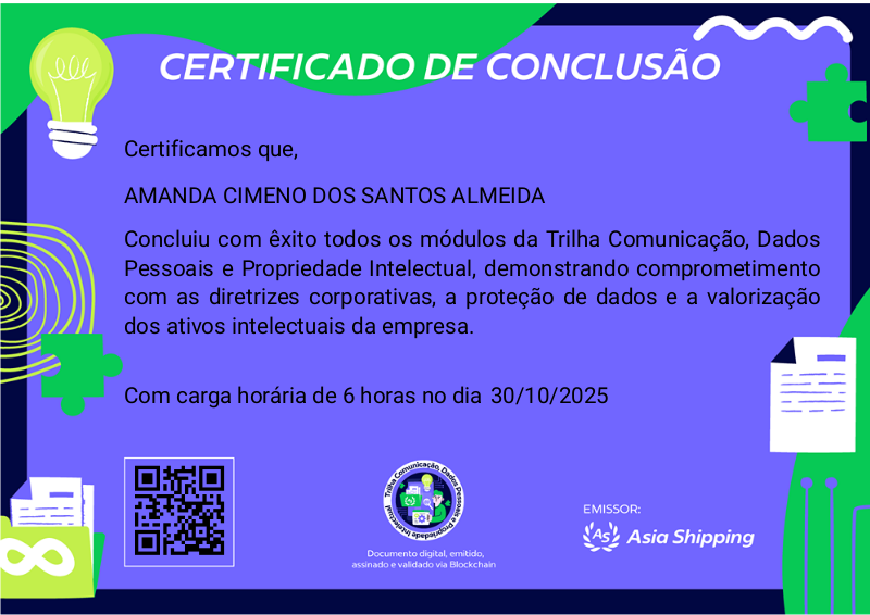 Esta badge certifica a conclusão da trilha Comunicação, Dados Pessoais e Propriedade Intelectual. O participante demonstrou domínio dos conhecimentos essenciais sobre boas práticas corporativas, conformidade legal e segurança da informação, pilares fundamentais para a integridade, a reputação e o sucesso da organização.
