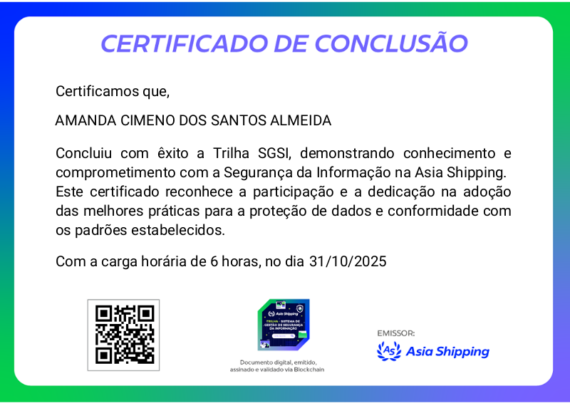 Esta badge é concedida aos colaboradores que completaram com sucesso a trilha de cursos sobre Segurança da Informação, demonstrando conhecimento e compromisso com as melhores práticas de proteção de dados e a conformidade com a política de segurança da Asia Shipping.
