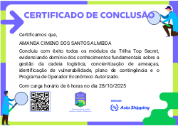 Esta badge certifica a conclusão da Trilha Top Secret. O participante demonstrou domínio sobre conceitos de Gestão da Cadeia Logística, conscientização de ameaças, identificação de vulnerabilidades, plano de Contingência e Programa de Operador Econômico Autorizado.