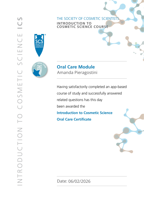 Completed the Oral Care module on the Society of Cosmetic Scientists (SCS) Introduction to Cosmetic Science (ICS) course and passed the module test.