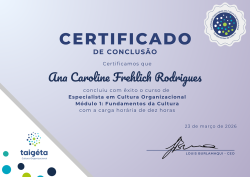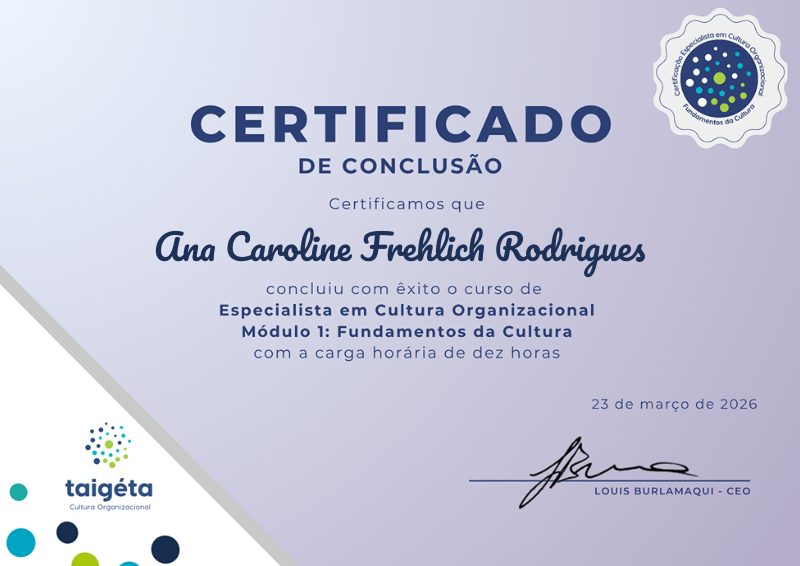 Para ganhar esta medalha e certificado, o aluno concluiu a carga horária do módulo 1 Fundamentos da Cultura Organizacional e entregou seu trabalho de conclusão de módulo com nota satisfatória.