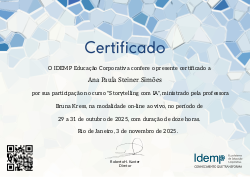São 12 horas de mergulho nas técnicas, teorias e práticas com análises de casos que não apenas ensinam a arte de contar histórias, mas também a transformar informações em experiências emocionantes e memoráveis. Nossa abordagem prática e interativa permitirá que você aplique imediatamente os conceitos aprendidos em diferentes contextos, como apresentações, marketing, negociações e liderança.
