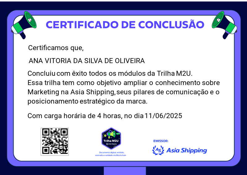 Esta badge é concedida aos colaboradores que completaram com sucesso a Trilha M2U, que teve como objetivo proporcionar uma visão estratégica sobre os pilares da comunicação e do posicionamento da marca, além de fortalecer o entendimento do marketing como ferramenta essencial no contexto organizacional.