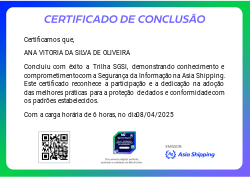 Esta badge é concedida aos colaboradores que completaram com sucesso a trilha de cursos sobre Segurança da Informação, demonstrando conhecimento e compromisso com as melhores práticas de proteção de dados e a conformidade com a política de segurança da Asia Shipping.