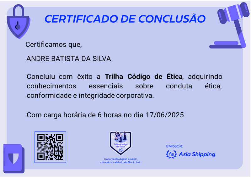 Este badge certifica a conclusão da Trilha Código de Ética. Atesta conhecimento em conduta íntegra, conformidade legal (LGPD, SGSI), anticorrupção e processos de investigação interna, essenciais para a organização.